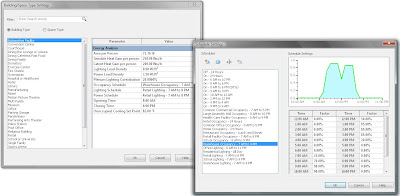 The second enhancement to spaces is found in the properties. The properties have been improved to give us the ability to further define the space type. The space type has been expanded to include Energy analysis settings. These include the ability to specify an Occupancy Schedule, Lighting Schedule, and Power Schedule. These schedules will dictate usage percentage factors. If the proposed building will be primarily used between the hours of 8:00-5:00, these can be specified and taken into account in analysis.